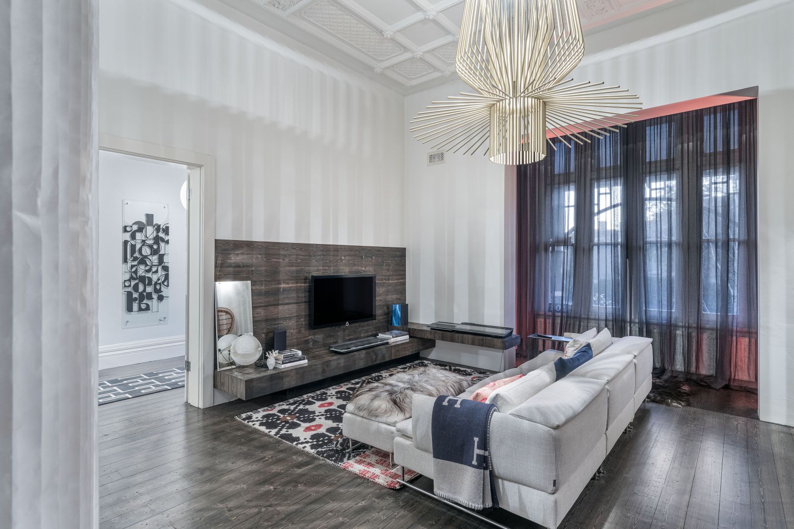 Brought to life by magnificently detailed 4.3m ceilings, a fluid lower level enjoys an ambiance of quiet refinement and distinction, with Multiplicity’s inspired ballroom reimagining artistically blending old and new. Dark timber floors merge with warm herringbone oak, with a vast main lounge and bedroom augmented by paired Italian pendant lights and full-height sheer curtains. Positioned around a focal leaning wall, a skylit ensuite and separate bath area complement an expansive Poliform dressing room, while a chic central bathroom serves a sun-soaked second bedroom with tranquil garden outlooks.