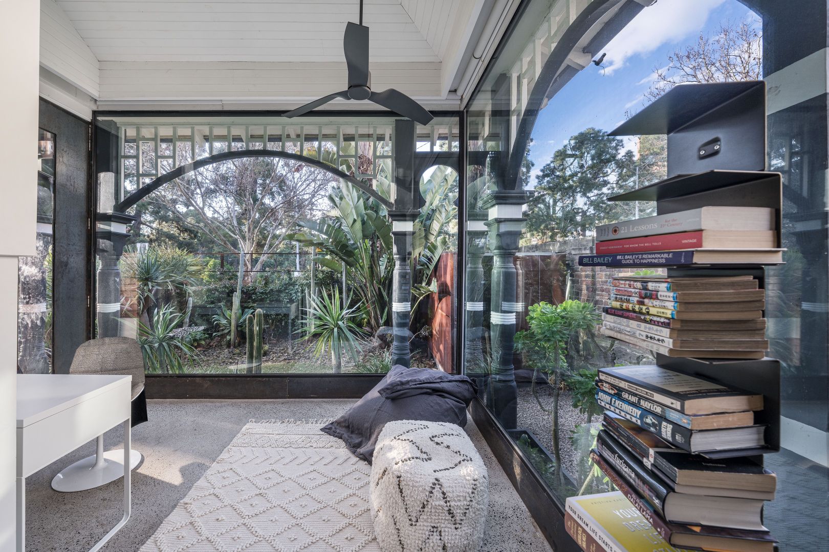 Providing clever bicycle storage underneath, an impressive staircase affords seamless flow between levels, with morning sunlight filtering through centrepiece stained-glass windows. Joined by a stylish ensuite, a substantial upper bedroom doubles as a superb home office, with Baltic pine floors enriching a sublime second storey. A transcendent entertainer’s domain, open living and dining areas adjoin a first-class enthusiast’s kitchen, with lengthy stone benches accompanied by upscale Smeg and Miele appliances. Ideal for a relaxing morning coffee, Sunday afternoon novel, or summer evening with guests, a glass-lined terrace presents stunning panorama, with sweeping views of vivid parklands, fireworks, and Melbourne’s skyline never to be built out.