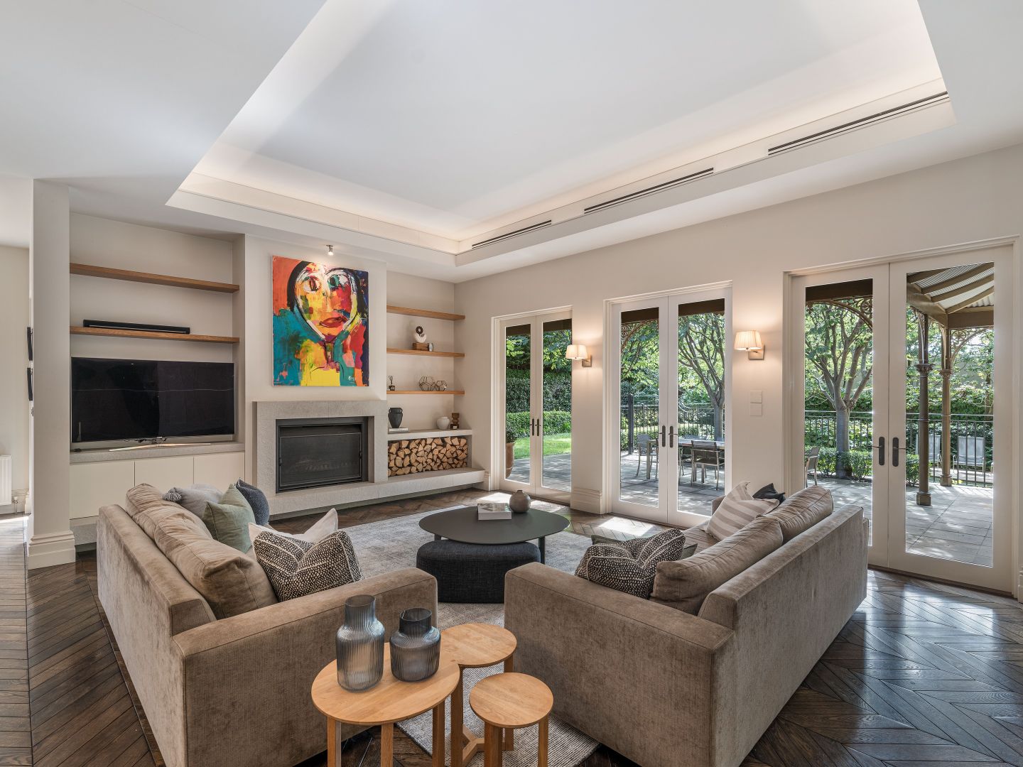 Fusing original and contemporary, Chevron-patterned parquetry flooring leads into an extraordinary main section, with a square-set ceiling’s clever recess gifting depth and dimension to a stunning family area. A first-class kitchen boasts Calacutta marble, plentiful cabinetry, and an upscale AGA cooker, alongside a concealed butler’s pantry and a centrepiece island. With an abundance of space to entertain a crowd on a sun-splashed afternoon, a verdant backyard wraps around to comprise multiple lounge settings, an open-air dining zone, barbecue area, grassed kids’ play space, and solar-heated pool.