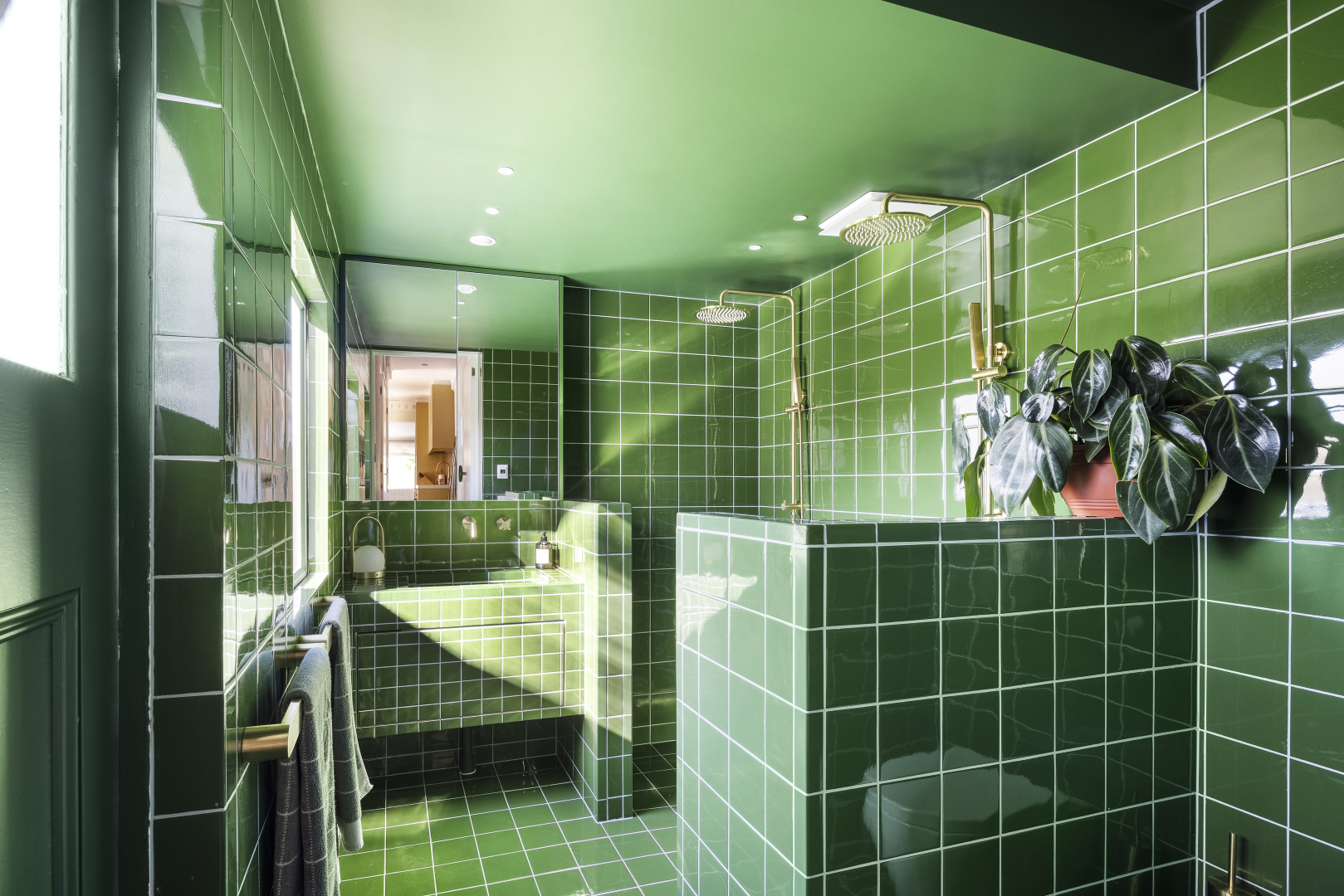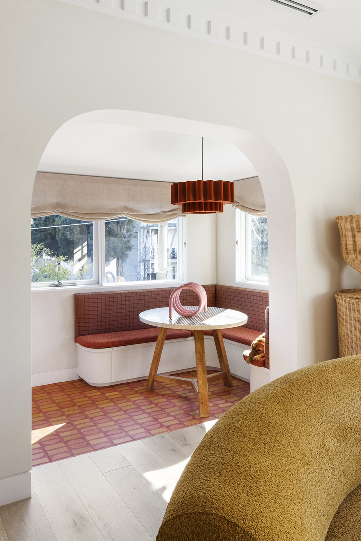 Occupying a considerable upper level, sublime interior spaces soak in streams of sunlight, with a cultured array of tones and textures central to the home’s charming individuality. Graced with vivid Perini tiles, a built-in banquette, and locally crafted, artisan pendant, a broad and inviting entrance foyer steps through a rounded, original arch, reaching a simply remarkable living/dining section with ideal northern orientation. Enlivened with a vibrant palette, a sleek, stellar kitchen boasts Perini splashback tiles and a centrepiece rose quartz island, complemented by class-leading Liebherr, Miele, and AEG appliances, abundant soft-close cabinetry, and a combined butler’s pantry/laundry.