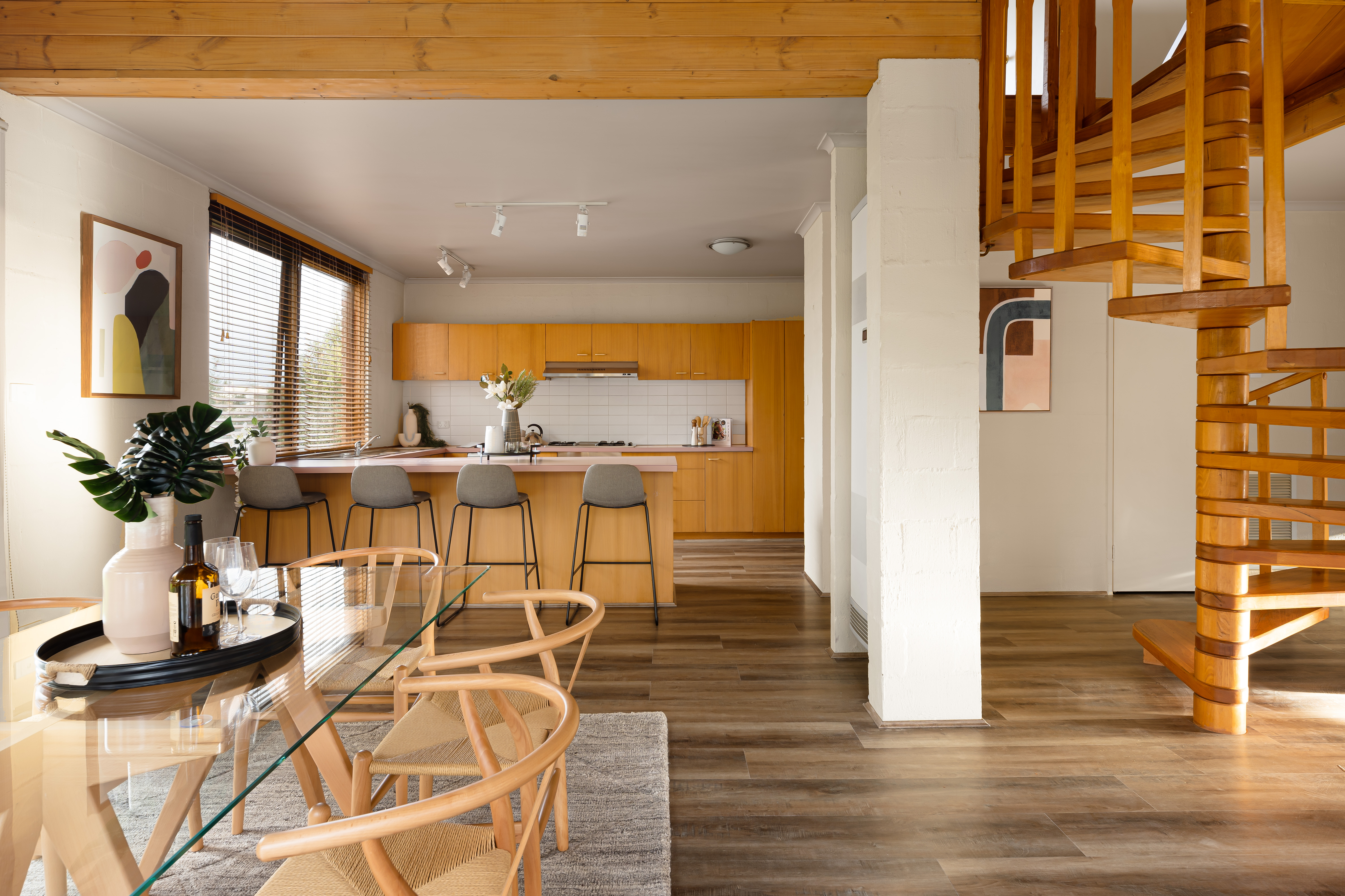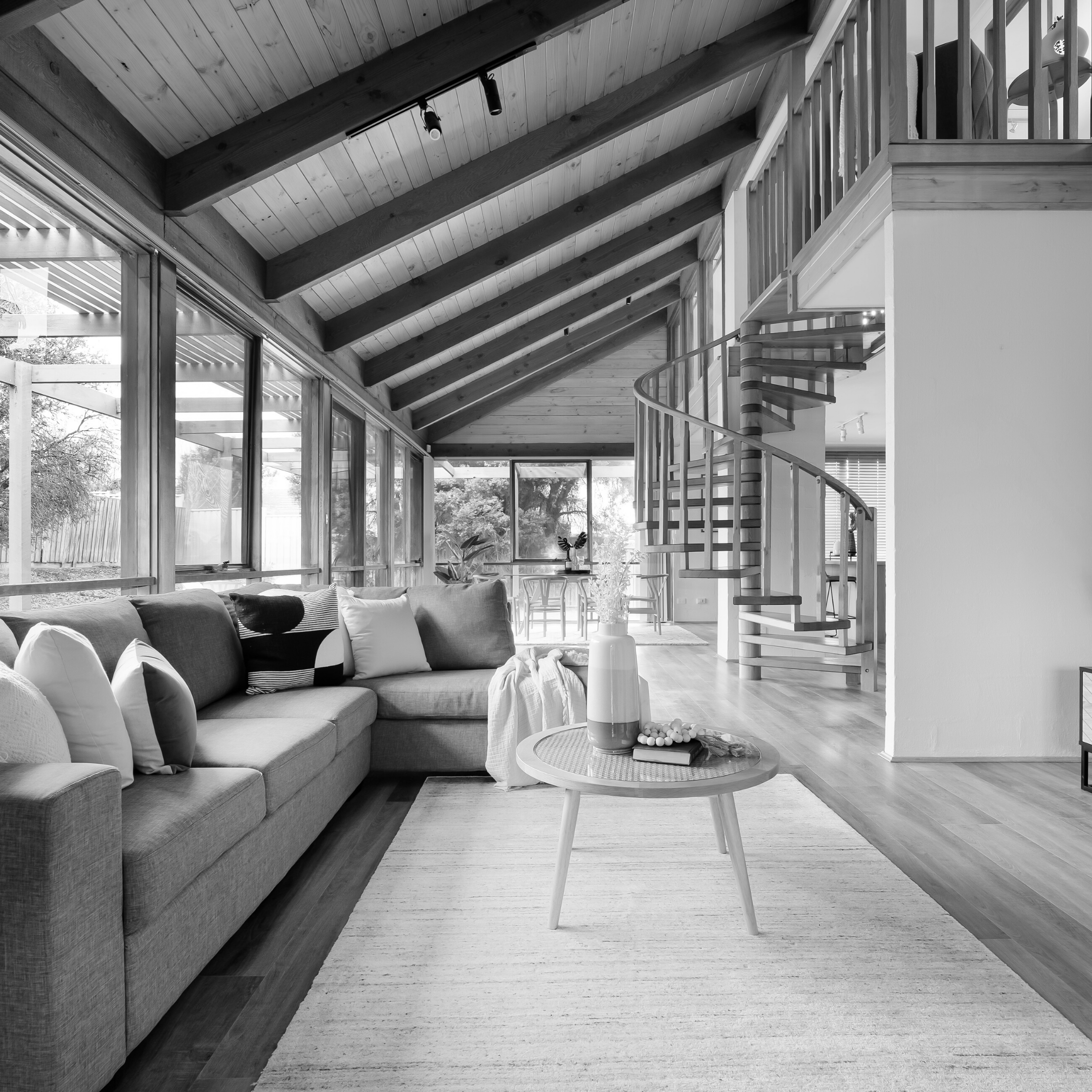 Proudly idiosyncratic, a soaring, exposed timber ceiling amplifies an airy ground floor atmosphere, while a smart second level boasts three bedrooms accompanied by a pair of elegant bathrooms. Occupying a minimal footprint, a locally crafted spiral staircase splits the stunning levels, directly inspired by avant-garde European architecture. A dedicated home office delivers ever-desired separation from living, while an upstairs gallery and centre point afford additional northern light via high-set windows.