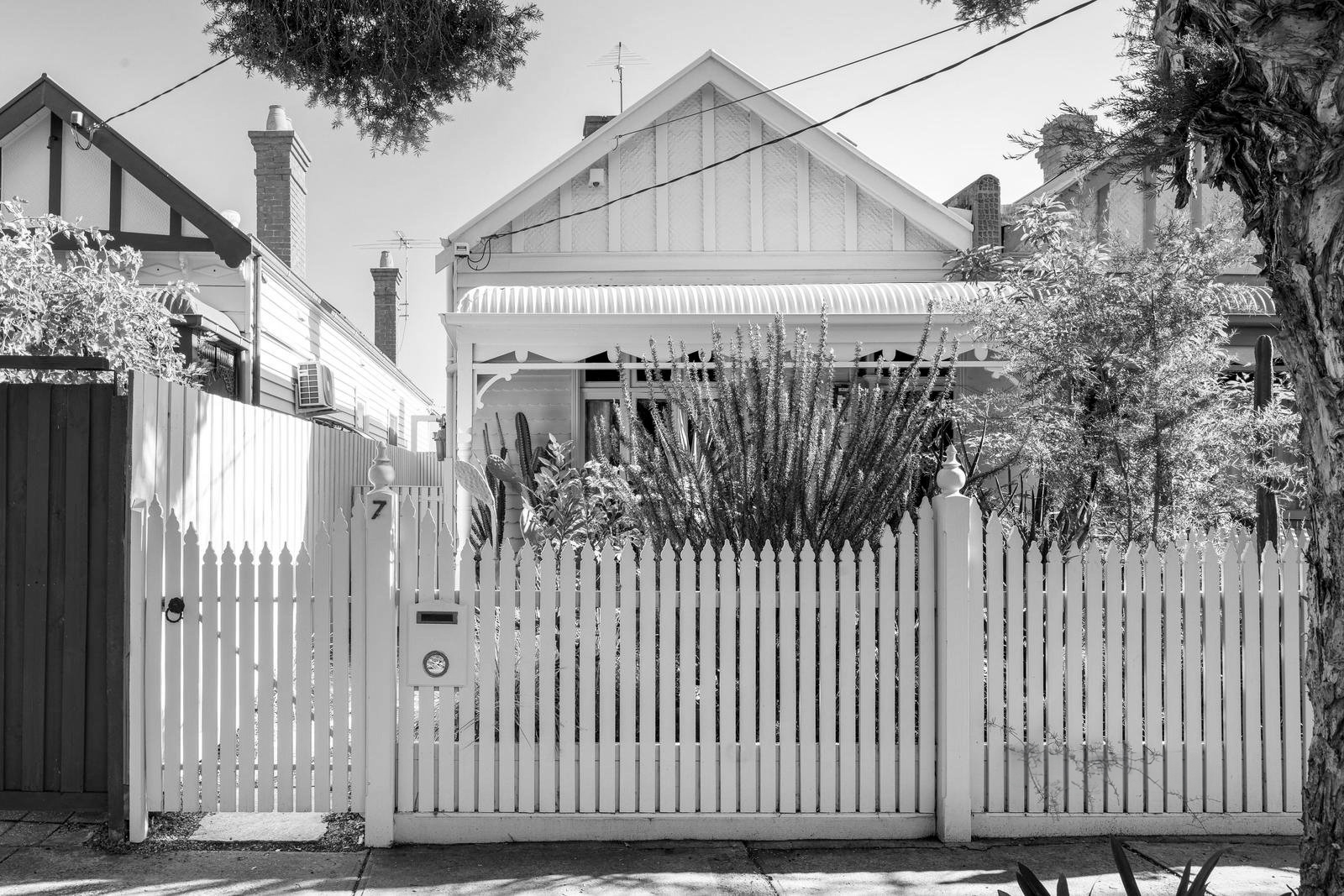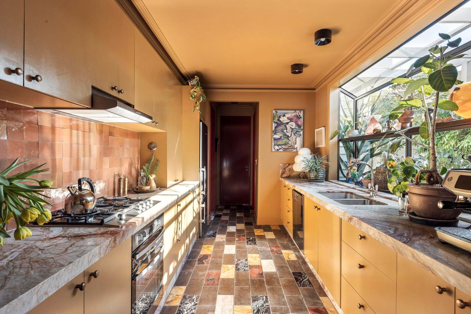 Behind a tall paperbark, classic picket fence, porch with palladiana stone floor, and lush, irrigated landscaping by Florian Wild, the home’s inspired interior sees exposed brickwork, Baltic pine floors, and high, ornate ceilings pay homage to c1901 origins, while countless luxuries and designer selections deliver refined comfort for the most discerning. An evocative palette of tones and textures is headlined by Belgian sheer and block-out curtains, new blackbutt-lined walls and ceilings, the vibrant blue of a central doorway, and deep reds offering a nod to French modernism, all joining an open wood fire in enlivening lounge and dining zones. A Spectra marble threshold marks movement to a kitchen with handmade tiles, swathes of quartzite, and a sink mixer by Perrin & Rowe, while a recessed feature window frames calming sights of thriving flora.