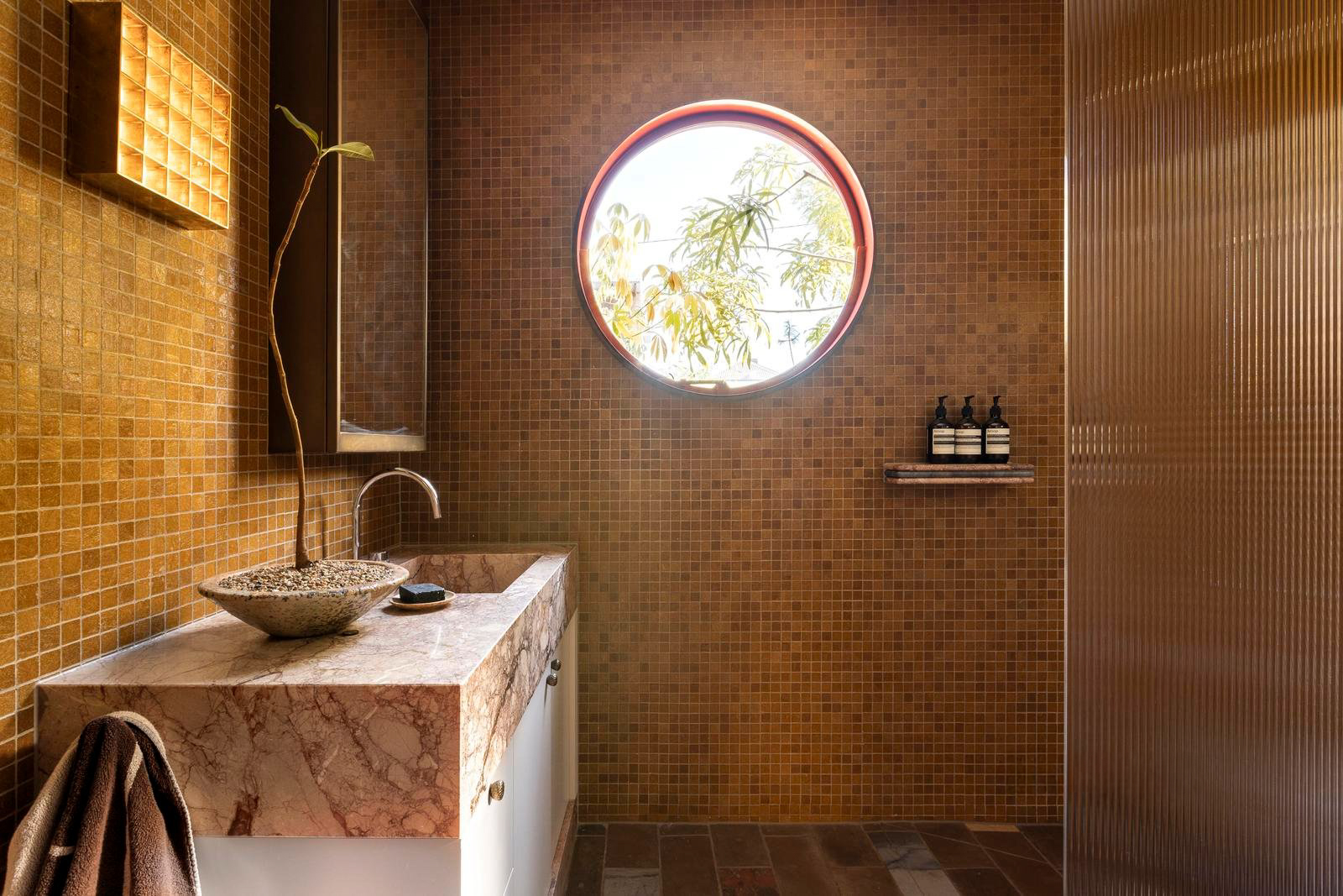Glancing at an entertainer’s backyard through a circular, steel-frame window, a first-class bathroom displays marble, terracotta, mosaic tiles, fluted glass, and a custom Volker Haug sconce, while a neighbouring powder room enjoys its own distinctive character courtesy of Venetian polished plaster, a quartzite floor and bespoke stainless-steel vanity. Smartly distinct from entertaining spaces, two substantial bedrooms are accompanied by impressive storage, while the home’s lengthy list of highlights includes solar energy, a Back2Base security system, hydronic and under-floor heating, air conditioning, extensive insulation, an entrance skylight, alarm, outdoor shower, 100% tufted-wool carpet, Joseph Giles door hardware, and Astra Walker tapware.